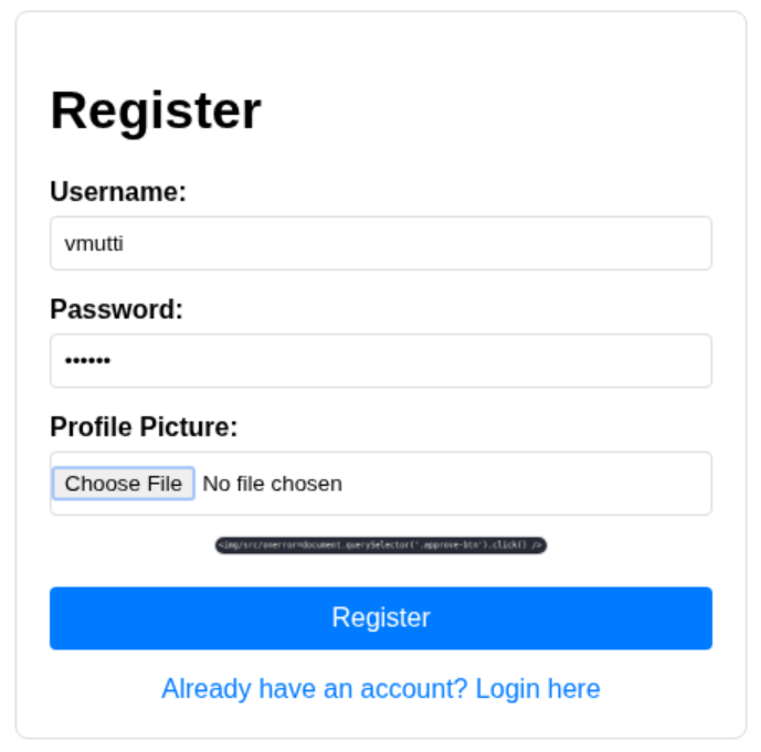 When the competition began, I focused on the first main quest as I had a hunch of what would be required to solve it. Whenever I see a web challenge that involves getting an administrator to perform some action, I know that we are likely either looking at an authorization issue or a cross-site scripting (XSS) issue. I focused on the XSS vector first because I didn't have the application source code yet and wasn't sure what the structure of the APIs was going to be exploiting an authorization issue and there was a hint that administrators are frequently reviewing new account submissions. The only inputs we have as attackers in this challenge are our usernames and a profile picture, which is analyzed by an LLM with the analysis appearing on our profile page.