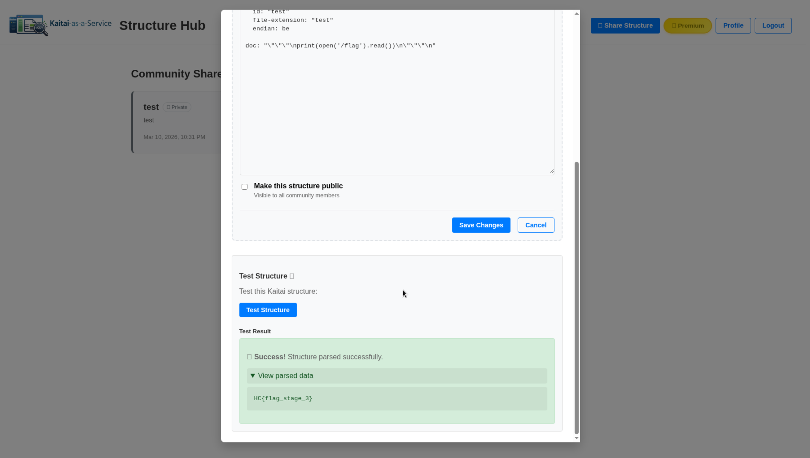 I later realized that I probably should have tried including tab characters in my injected input to make the indentation correct, but instead I was delighted to see that my inputs were automatically indented by Kaitai and my injection worked. I passed this structure file to the application and obtained the flag for the challenge.