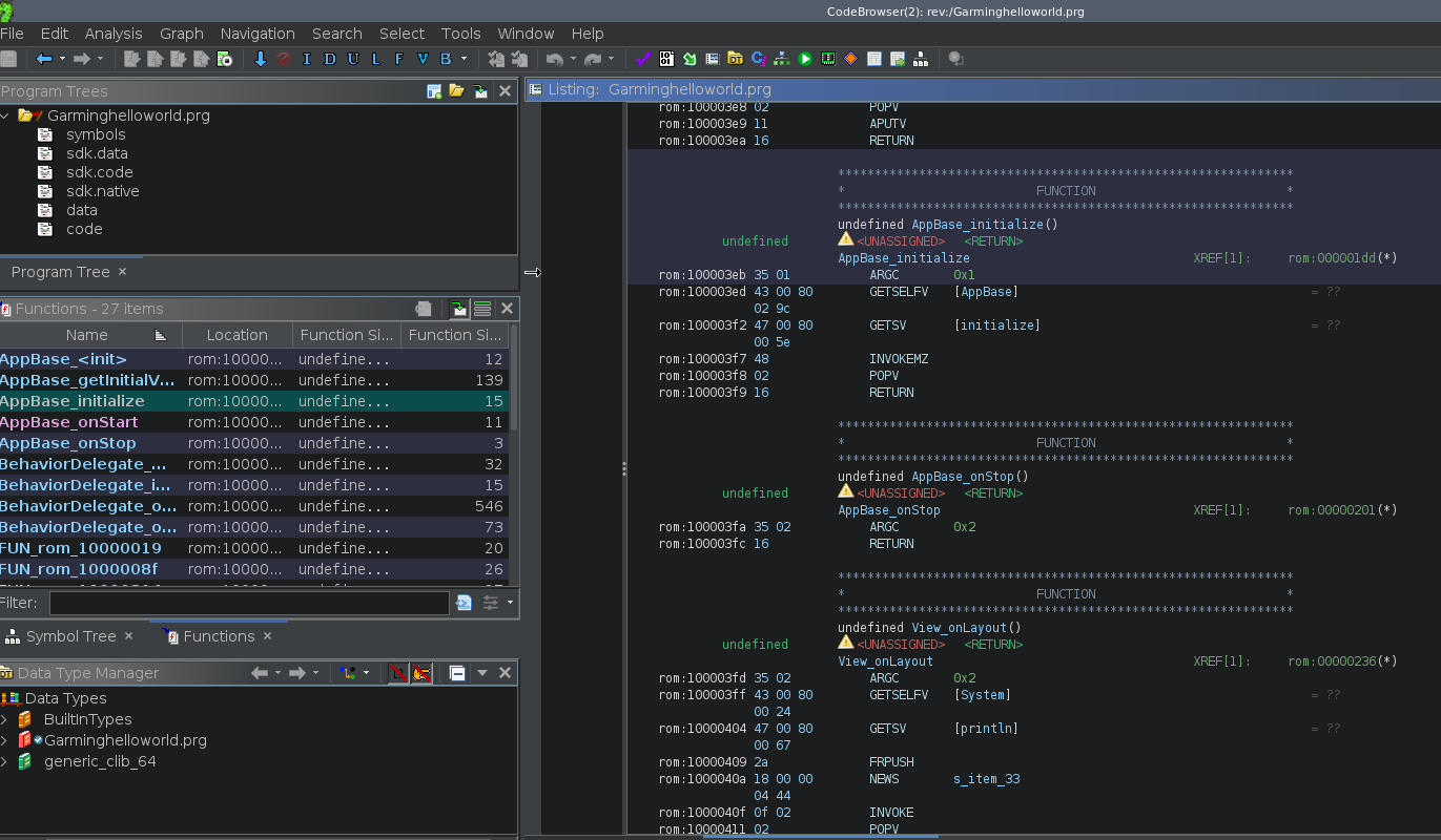 To make Ghidra understand Garmin watch applications, this project introduces a new processor definition representing the Garmin virtual machine used by PRG binaries.