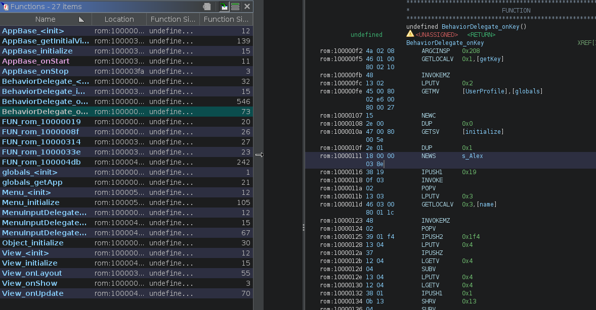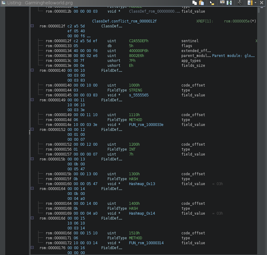 Kaitai Struct is an excellent tool for describing and parsing binary formats, and it does an amazing job understanding the high-level layout of Garmin PRG files. However, format parsing alone does not translate into a usable reverse-engineering workflow.