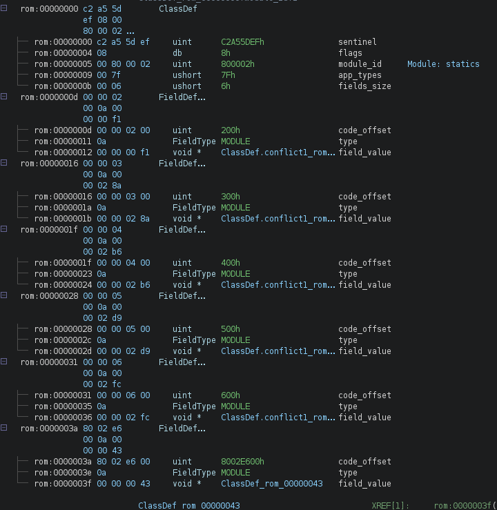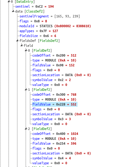 PRG binaries contain embedded module definitions. These are extracted and represented as structures inside Ghidra, allowing analysts to explore application logic at a higher level. While symbol value references are not yet fully resolved within the code section, the presence of these definitions improves readability and make browsing through the code much easier. An example is provided below: