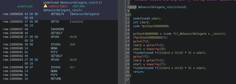 All known opcodes have a SLEIGH definition, enabling Ghidra’s decompiler. Some instructions still lack full semantic detail, so decompiled output may not always be perfect. As shown below, some opcodes do not have a semantic representation yet but they were left as pcode within the decompiler. This is still a work in progress.